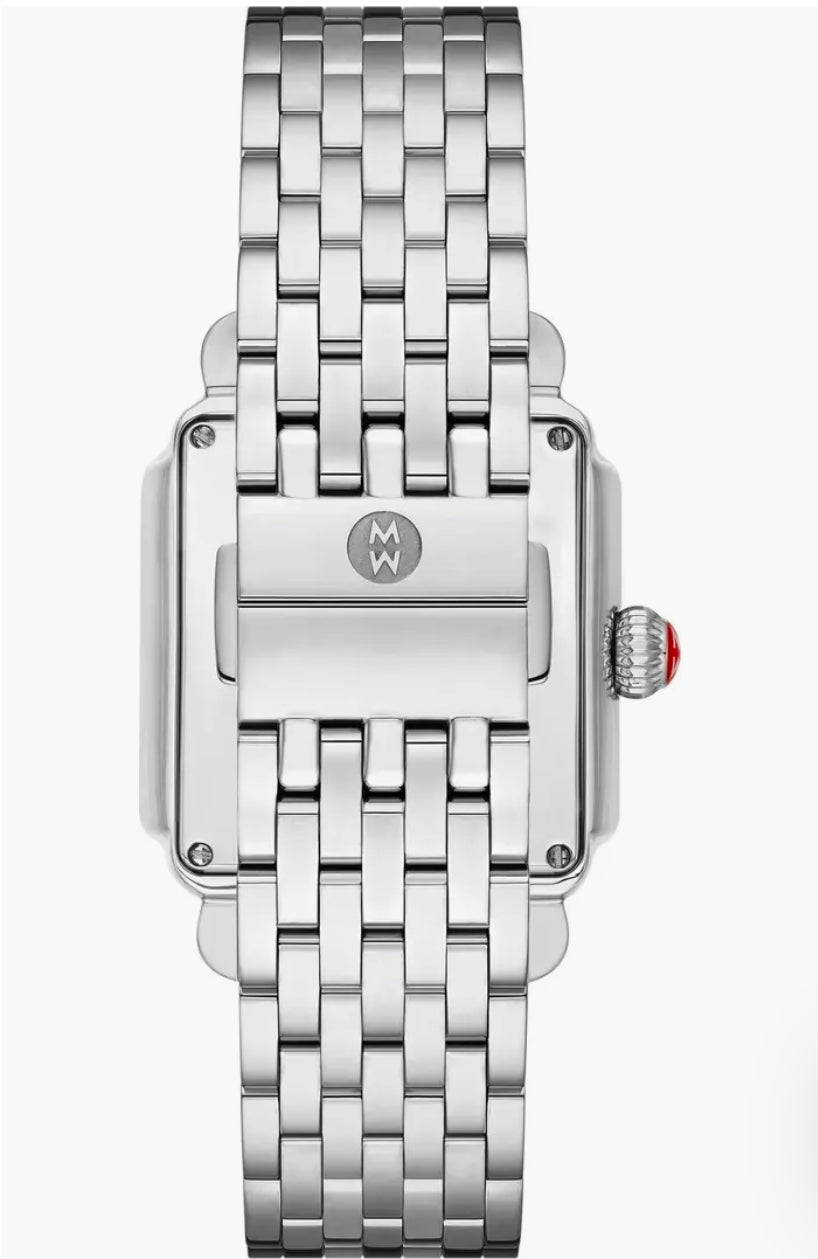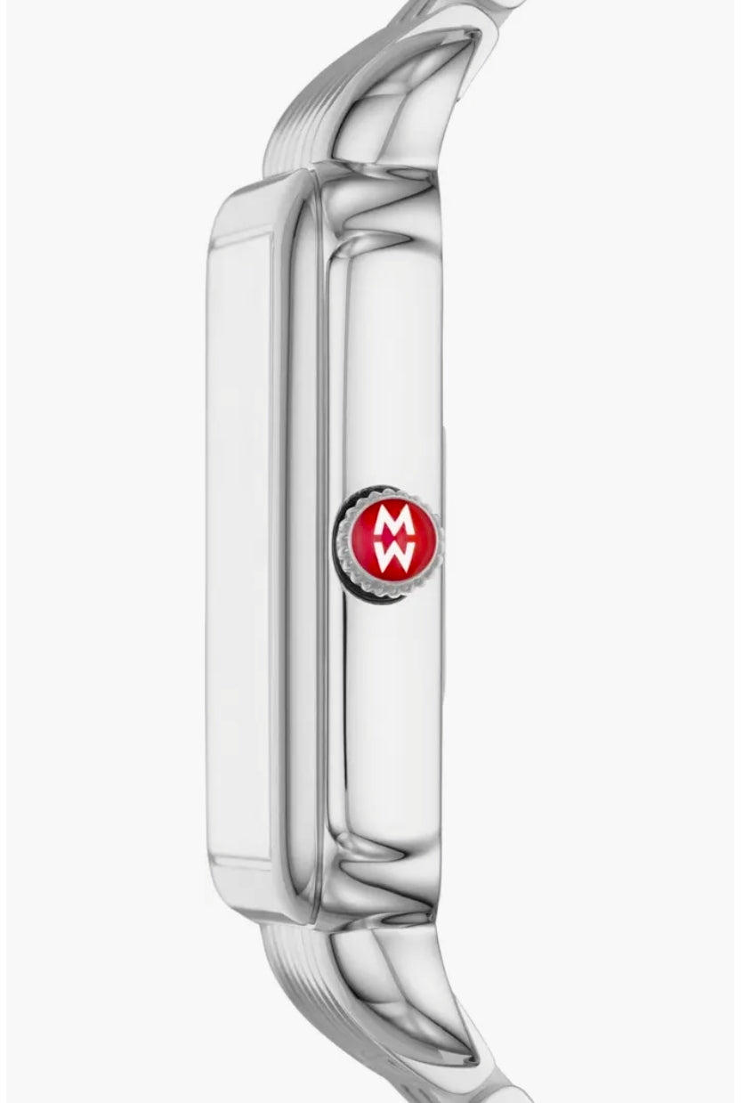 This stainless Deco II offers a sleek take on the classic Deco with silver-tone Roman numeral indexes and 47 diamonds on the silver sunray dial. The stainless bracelet is interchangeable with any 18mm MICHELE strap.